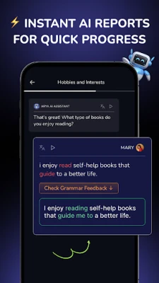 Learn English for travel, school, career, family, friends, or for your mental health. Our app offers bite-sized lessons to help you learn English quickly, including spoken English classes, basic English speaking, and spoken English vocabulary. ๐ซ Our AI-powered Spoken English trainer adapts to your learning style, providing personalized lessons to help you reach your goals faster.