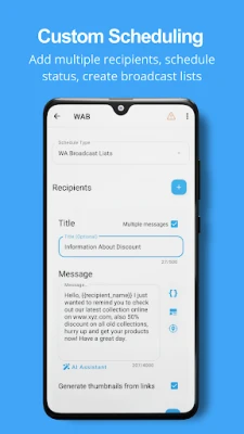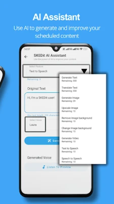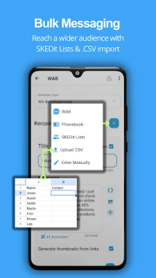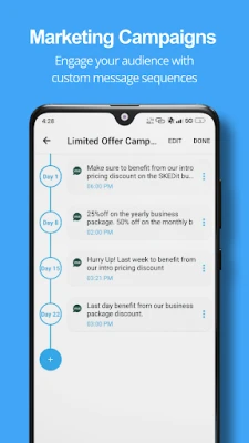Grow your business with SKEDit, the AI-powered all-in-one Scheduling & Autoresponder app. Schedule messages and statuses, set AutoReplies, and automate communication. Create powerful campaigns with AI-enhanced text generation, smart content improvement, and AI-powered image creation.