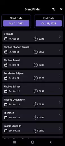 + Events Finder - go to the new Events section to unlock a powerful search engine that finds astronomical events visible tonight and far into the future. The finder dynamically generates a listing of moon phases, eclipses, planetary moon events, meteor showers and planetary phenomenon such as conjunctions, elongations and oppositions.