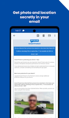 5. Privacy: Smart Protect does not store your photos or information on a central server. The information collected is sent only to your email and the GPS location is stored only on your device. This helps ensure your privacy and security.