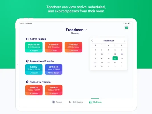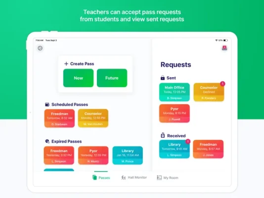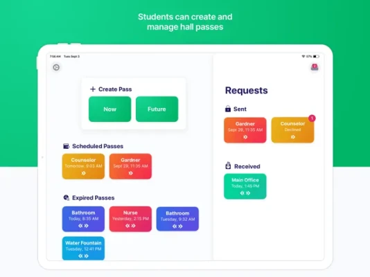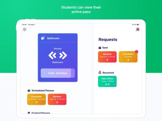 Teachers & Admins can: - Streamline hall passes with one-touch creation, approval, denial, or queuing - Prevent unsafe and disruptive incidents through encounter prevention and room restrictions - Deploy custom digital student ID cards, reducing costs, saving time, and improving record-keeping - Access analytics for live, pre-scheduled, and pattern-based insights into student movement to improve safety and security - Customize use to account for each student’s unique needs and accommodations