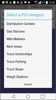 • Find Truck specific points of interest, truck stops, rest areas, repair facilities, weigh scales