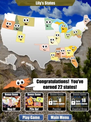You earn a random state for every successfully completed level. All of your states appear on your own personalized map of the United States. Try to collect all 50! As you earn more states, you begin to unlock the four free bonus games: Map It, Pile Up, Puzzler and Capital Drop. Four games in one!