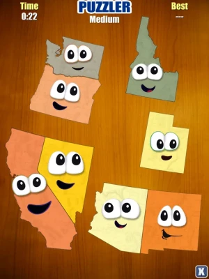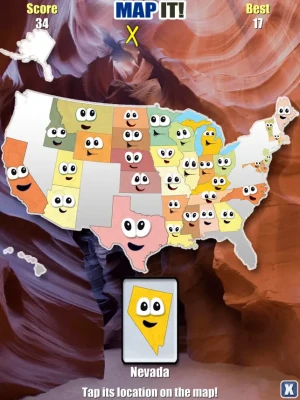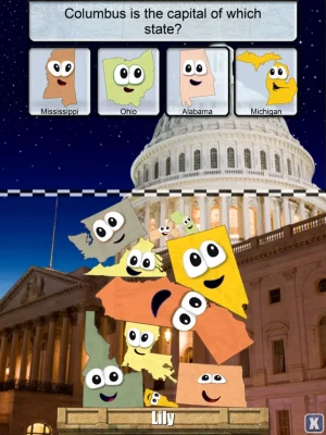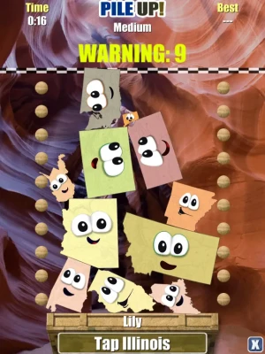 As you learn state capitals, shapes, geographic locations, flags and more, you can actually touch, move and drop the animated states anywhere on the screen. Carefully build a stack of states that reaches the checkered line to win each level.