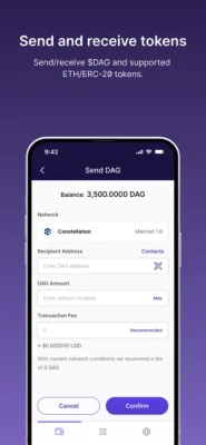 - DAG, Constellation’s native crypto token. Store, send, and receive — with zero transaction fees.