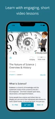 The Study.com app will help you learn any academic subject on the go. Our short, fun video lessons, taught by expert teachers, provide homework help for difficult topics from your classes with easy-to-understand examples and animations. Become a member to ace your next test with Study.com’s online courses and test prep.