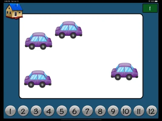 Flash cards with non-standard positioning of images up to twelve. Double click screen to show matching numeral. Swipe to move onto next card.