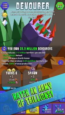 • Endless progression - start with a few lowly units, evolve and hatch your way to unimaginable numbers.