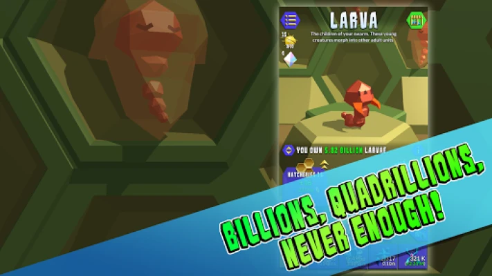 • Idle mode - the game will keep progressing whether it's open or not, take a break for a few hours and your Swarm will grow and grow!