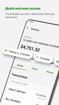 • Pay bills, deposit cheques, and manage TD Rewards.