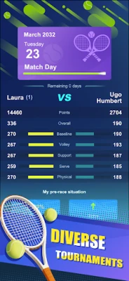 Game Features: 1. Unique skill system to build your own playstyle 2. Fast-paced and exciting progression 3. Simple controls, focus on tactics and skill mastery 4. Customizable upgrades to perfect your signature shots 5. Diverse tournaments: Junior, Tour, and Grand Slam events 6. Trophies and achievements to witness your rise from rising star to legend