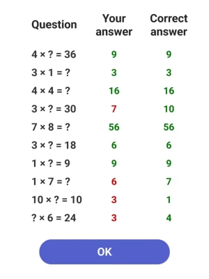 After each training or test, you have the opportunity to see which questions have been answered correctly and which have not. This will help next time to improve the result and remember the multiplication table!