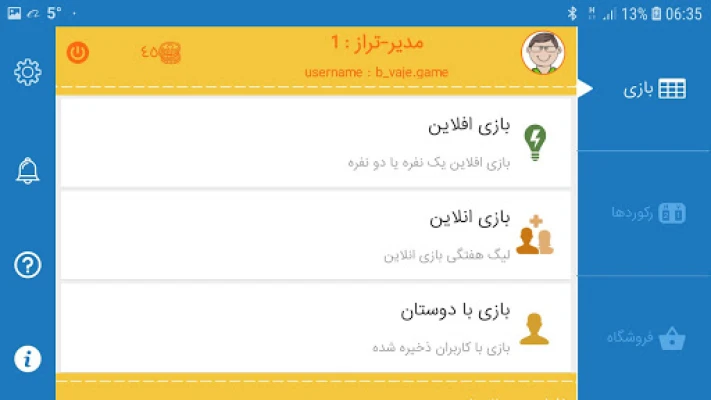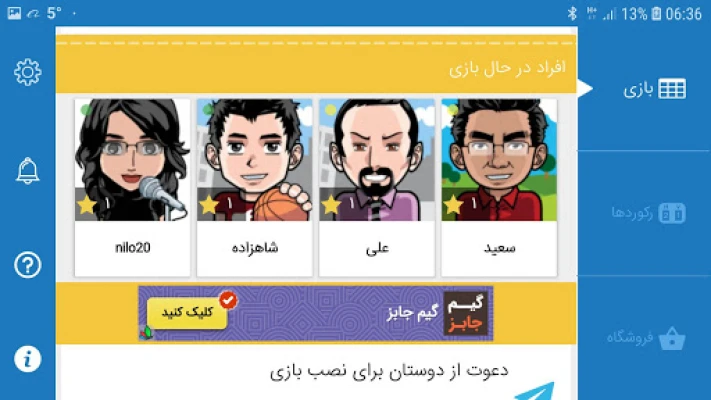 بازی با دوستان به دوستان خود سریع وصل شوید و بازی را شروع کنید رقابت هفتگی در رقابت هفتگی وضعیت خود را چک کنید بازی آسان. چندین اتاق مجرا بازی داریم و هر کدام سکه ها متفاوت - شما را به چالش با رقیبان دعوت می کنیم هماهنگ با بازی های شبرنگ موبایل هذه اللعبة باسم «طاولة الزهر أونلاين» يمكن لعبها باللغة العربية بصوت أونلاين.