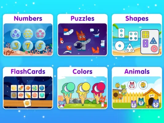 Our app offers a wide range of educational content tailored to the needs of children in the 1, 2, 3, 4, or 5 age group. It covers essential topics such as colors, shapes, numbers, math, flashcards, animals, ensuring a well-rounded learning experience for your child. The intuitive interface and child-friendly design make it easy for kids to navigate through the app independently.