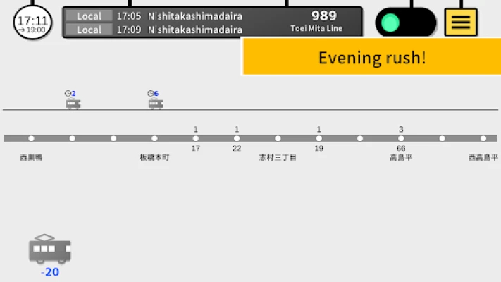 The ride time is displayed above the moving train. The ride time is deducted from the fare when the train transports passengers to the station where they will disembark. If you can transport passengers quickly, you can reduce the ride time.
