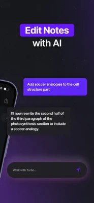 Turbo's advanced AI creates engaging notes featuring tables, emojis, diagrams, and equations, all synced seamlessly across our app and website (http://www.turbo.ai). Enhance your learning experience by chatting directly with your notes to extract deeper insights.