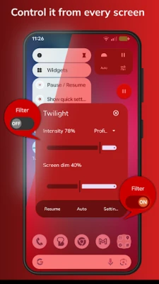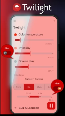 The Twilight app makes your device screen adapt to the time of the day. It filters the flux of blue light emitted by your phone or tablet after sunset and protects your eyes with a soft and pleasant red filter. The filter intensity is smoothly adjusted to the sun cycle based on your local sunset and sunrise times.