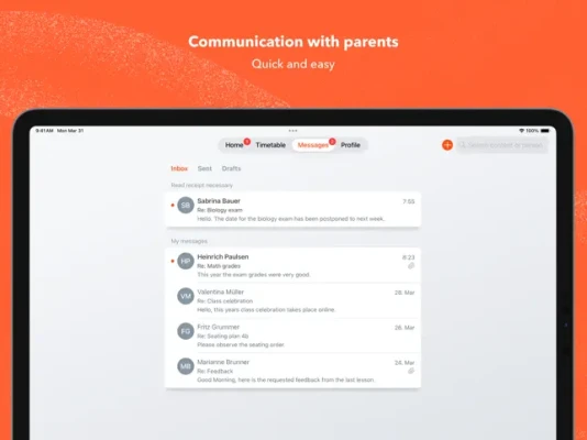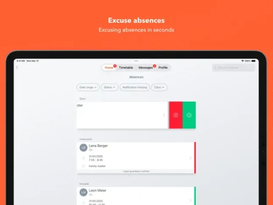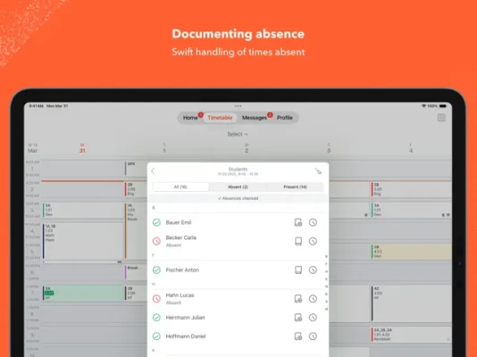 - Digital class register: Attendance check, class register entries, sick note by students or parents