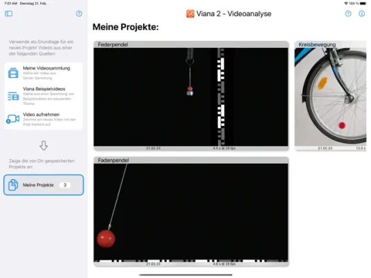 Viana ist eine speziell für den Physikunterricht entwickelte App. Sie ermöglicht das Aufnehmen und Auswerten von Bewegungen aller Art. Aus Videos, die zum Beispiel mit Hilfe der integrierten Kamera des iPads aufgenommen werden, kann Viana for iOS automatisch die Trajektorie, Position und Geschwindigkeit von Objekten aller Art ermitteln