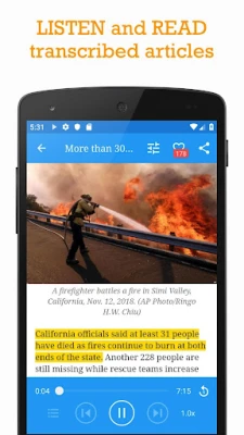 * Transcript tracking: the audio transcripts are highlighted and auto scrolled to help you focus on listening