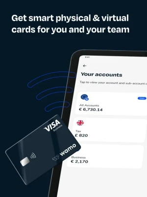 Open your wamo business account in minutes and create as many sub-accounts as you like. It’s the best way to streamline your finances. Use sub-accounts to manage and budget for your teams, projects and business expenses. Each sub-account can be connected to a physical and/or virtual Visa debit card issued and managed by you.