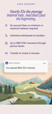 Cash Account is offered by Wealthfront Brokerage LLC (“Wealthfront Brokerage”), a Member of FINRA/SIPC. Neither Wealthfront Brokerage nor any of its affiliates are a bank, and Cash Account is not a checking or savings account. We convey funds to partner banks who accept and maintain deposits, provide the interest rate, and provide FDIC insurance. Rate is subject to change. Investment management and advisory services--which are not FDIC insured--are provided by Wealthfront Advisers LLC (“Wealthfront Advisers”), an SEC-registered investment adviser, and financial planning tools are provided by Wealthfront Software LLC (“Wealthfront”). The Stock Investing Account is a limited-discretion investment product offered by Wealthfront Advisers.