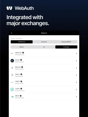 - Exchange Integration: Send and receive directly with Metal Pay, Metal X, KuCoin, Bithumb, Gate.io, HitBTC, CoinEx, MEXC, and more.