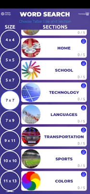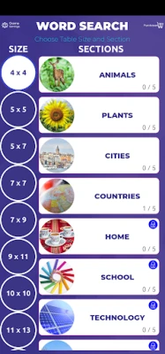 Find the words on the given board with the word search game. Try to find words in easy or very difficult levels with numerous sections and different board sizes.