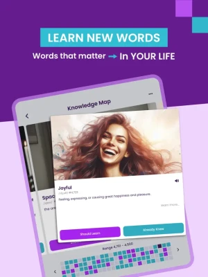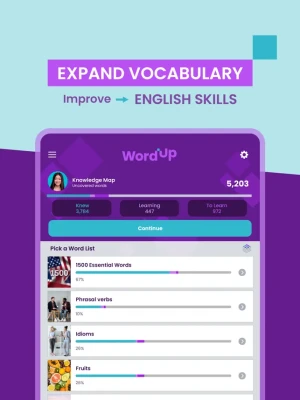 WordUp helps you build a map of your knowledge by identifying the words you know and the words you don't know. It helps you learn new words by identifying the gaps in your vocabulary and suggesting the most important and useful English words to focus on. By incorporating daily vocabulary and tracking your progress, the Knowledge Map enables you to steadily increase your vocabulary and enhance your understanding of English words.
