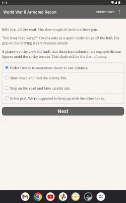 "World War II Armored Recon" is an interactive novel of approximately 900,000 words by Allen Gies, the lead writer for "Burden of Command." It's entirely text-based, without graphics or sound effects, and fueled by the vast, unstoppable power of your imagination.