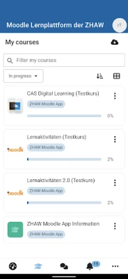 Mit der offiziellen Moodle App der Zürcher Hochschule für Angewandte Wissenschaften ZHAW können Sie auf Kursinhalte zugreifen (auch offline), Mitteilungen empfangen und versenden, wichtige Abgabedaten prüfen, erhaltene Bewertungen einsehen und vieles mehr.
