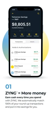^ZYNG automatically rounds up debit card purchases to the nearest dollar and transfers that amount from your ZYNLO More Spending Account into your ZYNLO Tomorrow Savings Account. ZYNG will match roundups at 100% for the first 100 days. After 100 days, ZYNG will continue to match roundups at 100% if you maintain an average daily balance of $5,000 in your More Spending Account. Spending Accounts that maintain less than the minimum average daily balance will be matched at 25%. Match dollars will be deposited in real time based on the average daily balance (ADB) of the previous statement cycle. ZYNLO More Spending with ZYNG Round Up and Match return is estimated using $5,000 average daily balance, 20 monthly transactions, an average of $0.44 per roundup, and 100% match.